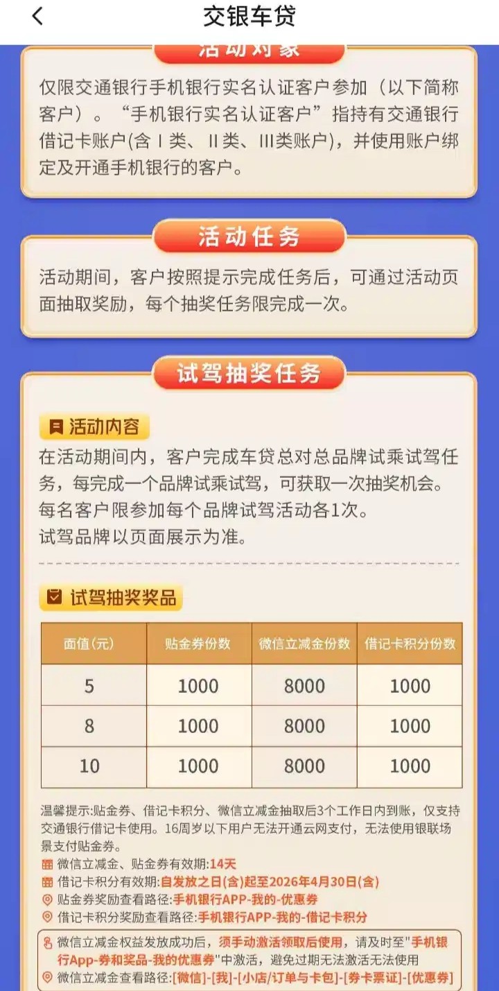 有交通银行的哥们可以去APP上搜索“交银车贷”进去预约试驾有两次抽奖机会可以得立减金