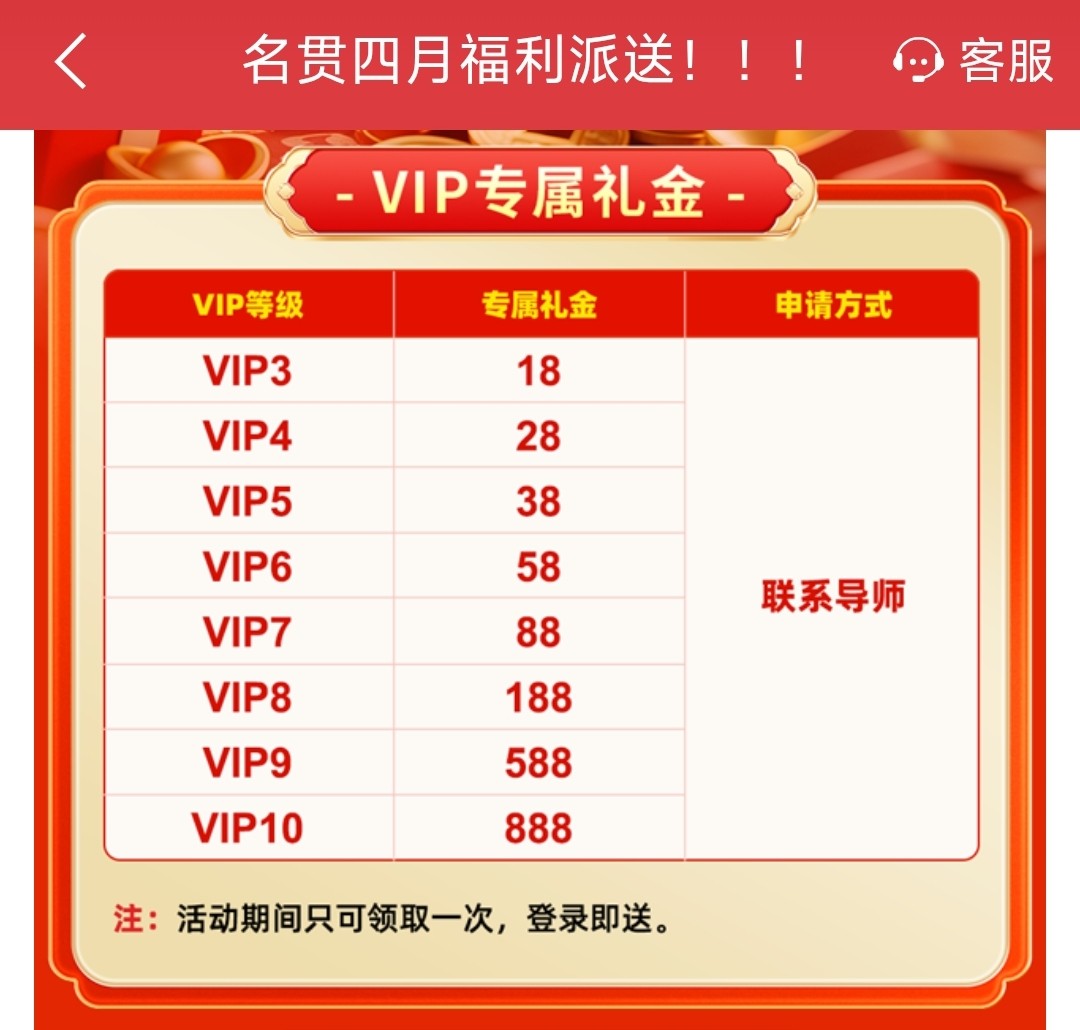 VIP等级专属彩金,需要VIP3以上才能领取,符合的老哥可以登入上联系自己导师领取彩金