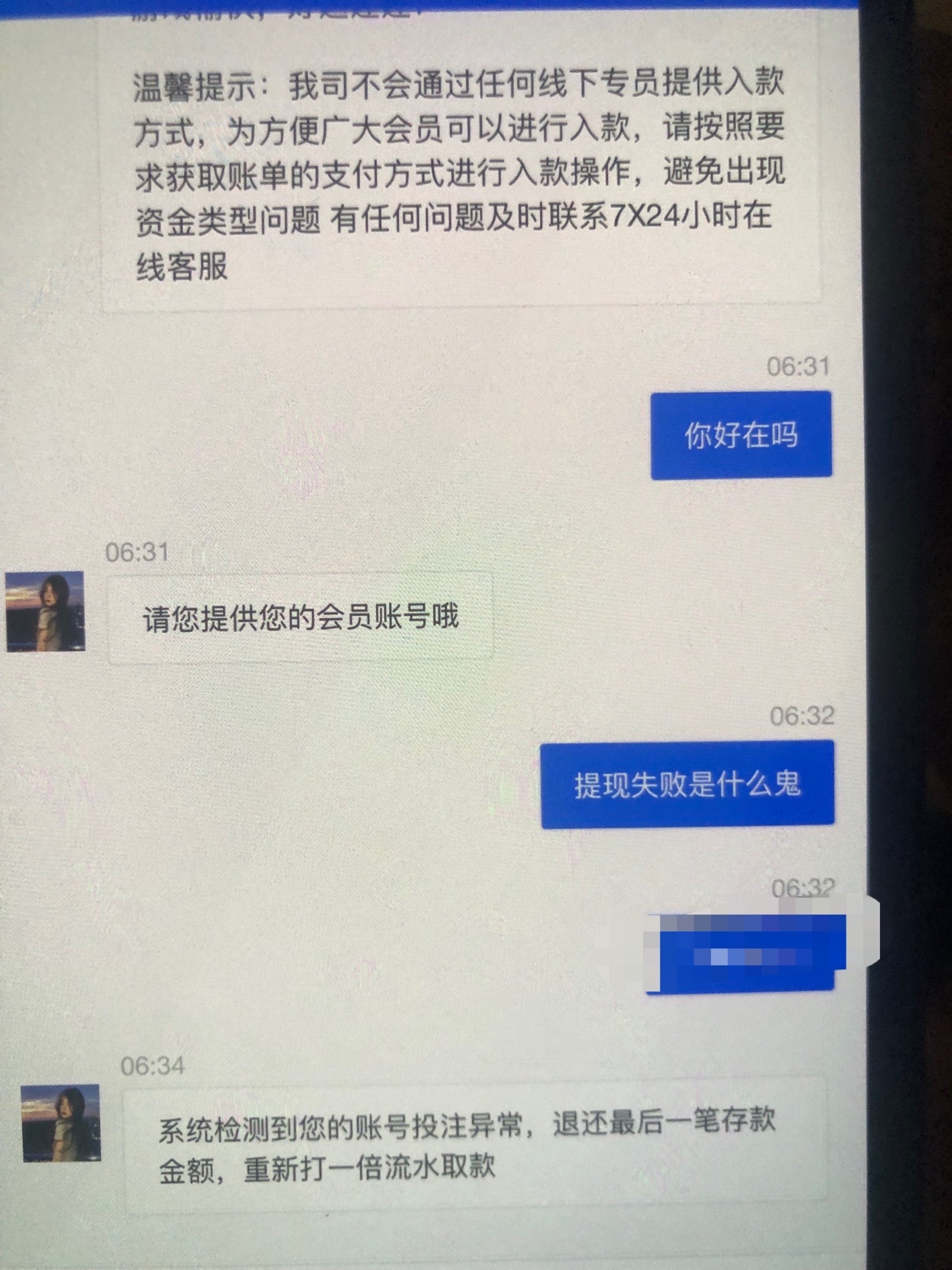 辣鸡澳门新葡京  和非凡腾博会一样黑,非凡都没那么黑   这个逼也是100+100八水活动都一样  打够水了提700说异常投注  总结操他妈就对了  那么坑 赢了就异常  输了怎么不打电话过来说我异常 退我本金,,,网址就不公布了  怕傻狗以为自己牛逼不怕死也去搞 ,